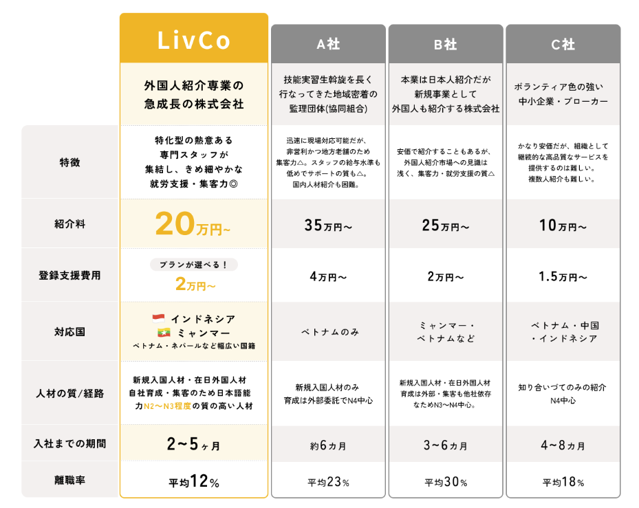求人掲載や外国人求職者とのやり取りなど入社決定までの費用は0円の完全成功報酬型のサービス。紹介料は想定年収の約12%で業界最安値。また、紹介した人材が早期退職した場合無償で代替人材をご紹介致します。